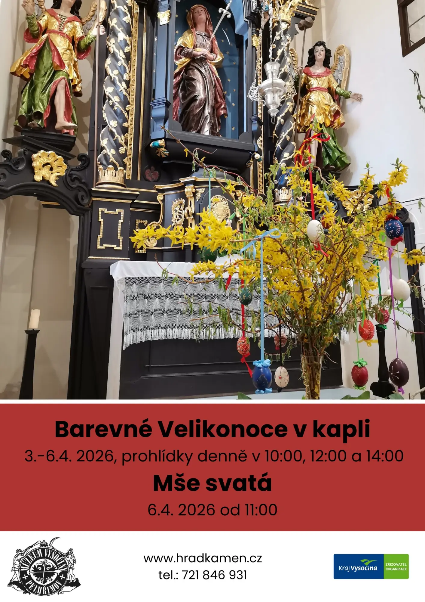 Muzeum Vysočiny Pelhřimov, p. o. všechny srdečně zve na zahájení 5. návštěvnické sezóny v kapli Panny Marie Bolestné v Kámeni, a to v období velikonočních svátků od pátku 3. 4. do pondělí 6. 4. 2026.